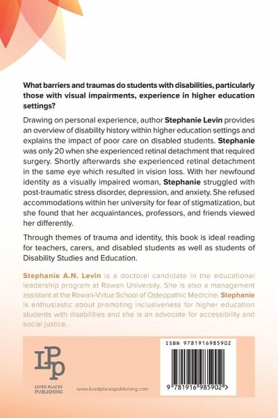 What barriers and traumas do students with disabilities, particularly those with visual impairments, experience in higher education settings? Drawing on personal experience, author Stephanie Levin provides an overview of disability history within higher education settings and explains the impact of poor care on disabled students. Stephanie was only 20 when she experienced retinal detachment that required surgery. Shortly afterwards she experienced retinal detachment in the same eye which resulted in vision loss. With her newfound identity as a visually impaired woman, Stephanie struggled with post-traumatic stress disorder, depression, and anxiety. She refused accommodations within her university for fear of stigmatization, but she found that her acquaintances, professors, and friends viewed her differently. Through themes of trauma and identity, this book is ideal reading for teachers, carers, and disabled students as well as students of Disability Studies and Education.