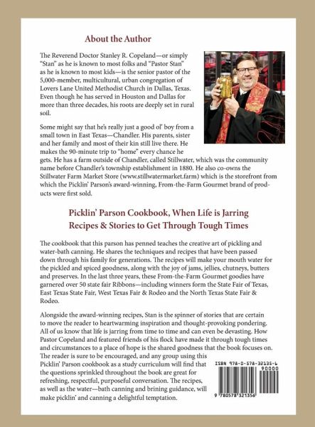 The cookbook that this parson has penned teaches the creative art of pickling and water-bath canning. He shares the techniques and recipes that have been passed down through his family for generations. The recipes will make your mouth water for the pickled and spiced goodness, along with the joy of jams, jellies, chutneys, butters and preserves. In the last three years, these From-the-Farm Gourmet goodies have garnered over 50 state fair ribbons-including winners from the State Fair of Texas, East Texas State Fair, West Texas Fair & Rodeo and North Texas State Fair & Rodeo. Alongside the award-winning recipes, Stan is the spinner of stories that are certain to move the reader to heartwarming inspiration and thought-provoking pondering. All of us know that life is jarring from time to time and can even be devastating. How Pastor Copeland and featured friends of his flock have made it through tough times and circumstances to a place of hope is the shared goodness that the book focuses on. The reader is sure to be encouraged, and any group using this Picklin' Parson cookbook as a study curriculum will find that the questions sprinkled throughout the book are great for refreshing, respectful, purposeful conversations. The recipes-as well as the water-bath canning and brining guidance-will make picklin' and canning a delightful temptation.