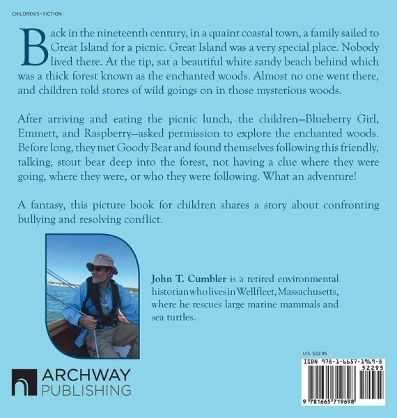 Back in the nineteenth century, in a quaint coastal town, a family sailed to Great Island for a picnic. Great Island was a very special place. Nobody lived there. At the tip, sat a beautiful white sandy beach behind which was a thick forest known as the enchanted woods. Almost no one went there, and children told stores of wild goings on in those mysterious woods. After arriving and eating the picnic lunch, the children-Blueberry Girl, Emmett, and Raspberry-asked permission to explore the enchanted woods. Before long, they met Goody Bear and found themselves following this friendly, talking, stout bear deep into the forest, not having a clue where they were going, where they were, or who they were following. What an adventure! A fantasy, this picture book for children shares a story about confronting bullying and resolving conflict.