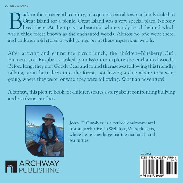 Back in the nineteenth century, in a quaint coastal town, a family sailed to Great Island for a picnic. Great Island was a very special place. Nobody lived there. At the tip, sat a beautiful white sandy beach behind which was a thick forest known as the enchanted woods. Almost no one went there, and children told stores of wild goings on in those mysterious woods. After arriving and eating the picnic lunch, the children-Blueberry Girl, Emmett, and Raspberry-asked permission to explore the enchanted woods. Before long, they met Goody Bear and found themselves following this friendly, talking, stout bear deep into the forest, not having a clue where they were going, where they were, or who they were following. What an adventure! A fantasy, this picture book for children shares a story about confronting bullying and resolving conflict.