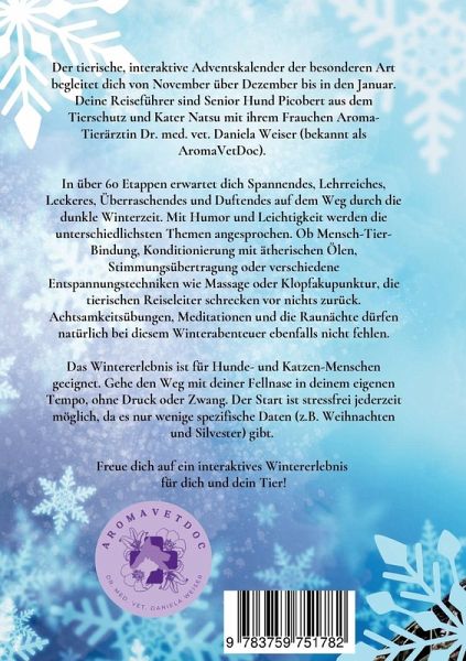 Der tierische, interaktive Adventskalender der besonderen Art begleitet dich von November über Dezember bis in den Januar. Deine Reiseführer sind Senior Hund Picobert aus dem Tierschutz und Kater Natsu mit ihrem Frauchen Aroma-Tierärztin Dr. med. vet. Daniela Weiser (bekannt als AromaVetDoc). In über 60 Etappen erwartet dich Spannendes, Lehrreiches, Leckeres, Überraschendes und Duftendes auf dem Weg durch die dunkle Winterzeit. Mit Humor und Leichtigkeit werden die unterschiedlichsten Themen angesprochen. Ob Mensch-Tier-Bindung, Konditionierung mit ätherischen Ölen, Stimmungsübertragung oder verschiedene Entspannungstechniken wie Massage oder Klopfakupunktur, die tierischen Reiseleiter schrecken vor nichts zurück. Achtsamkeitsübungen, Meditationen und die Raunächte dürfen natürlich bei diesem Winterabenteuer ebenfalls nicht fehlen. Das Wintererlebnis ist für Hunde- und Katzen-Menschen geeignet. Gehe den Weg mit deiner Fellnase in deinem eigenen Tempo, ohne Druck oder Zwang. Der Start ist stressfrei jederzeit möglich, da es nur wenige spezifische Daten (z.B. Weihnachten und Silvester) gibt. Freue dich auf ein interaktives Wintererlebnis für dich und dein Tier! Fachleute aus der Hunde- und Katzenwelt sind begeistert: Ein Silvesterkurs in einem Buch verpackt. Grandios! Daniela hat es mal wieder geschafft, fundiertes Wissen einfach und verständlich zu erklären. Mit humorvoller und spielerischer Art auf wichtige Themen rund um den Hund aufmerksam gemacht. Ätherische Öle seien nichts für Katzen, mit diesem Mythos räumte Frau Dr. Weiser bereits auf. Jetzt hat sie ein Buch über die Mensch-Tier-Bindung geschrieben, welches ich von Herzen empfehlen kann. Die Katze kommt darin auf keinen Fall zu kurz. Natsu sei dank! Mit viel Fundament zur Lösung. Übungen und Techniken, wie die Klopfakupunktur, sind einfach erklärt und beschrieben.