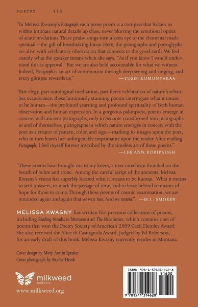 ""If you want the earth as it really is," N. Scott Momaday writes, "learn it through its sacred places." With this quote as her guiding light, Melissa Kwasny traveled to the ancient pictograph and petroglyph sites around her rural Montana home. The poems in this collection emerge from these visits and capture the natural world she encounters around the sacred art, filling it with new, personal meaning: brief glimpses of starlight through the trees become a reminder of the impermanence of life, the controlled burn of a forest a sign of the changes associated with aging. Unlike traditional nature poets, however, Kwasny acknowledges the active spirit of each place, agreeing that, "we make a sign and we receive." Not only do we give meaning to nature, Kwasny suggests, but nature gives meaning to us. As the collection closes, the poems begin to coalesce into a singular pictograph, creating "a fading language that might be a bridge to our existence here.""--