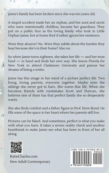 Jamie's family has been broken since she was ten years old. A stupid accident made her an orphan, and her aunt and uncle who were intentionally childless, became her guardians. They put on a public face as the loving family who took in Little Orphan Jamie, but at home they'd rather ignore her existence. Were they abusive? No. Were they subtle about the burden they bear because she's in their home? Also no. So when Jamie turns eighteen, she takes her life - and her trust fund - in hand and finds her own way. She leaves Florida for New York to attend Clarkmore Univserity and pursue her dreams of being a writer. ¿ Jamie has this image in her mind of a picture perfect life. Two living, loving parents, everyone together. Maybe even the siblings she never got to have. She wants that life. When she becomes friends with roommates Scott and Duncan, she believes one of them has that perfect family she so desperately wants. She also finds comfort and a father figure in Prof. Drew Bond. He fills some of the space in her heart where her parents still live. Pictures can be faked. And sometimes, perfect is what you make with what you have. It takes a severe reality check and another heartbreak to make Jamie see what has been in front of her all along.