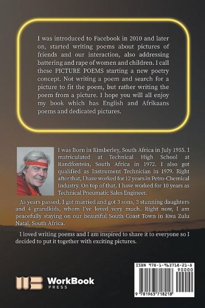 I was introduced to Facebook in 2010 and later on, started writing poems about pictures of friends and our interaction, also addressing battering and rape of women and children. I call these PICTURE POEMS starting a new poetry concept. Not writing a poem and searching for a picture to fit the poem, but rather writing the poem from a picture. I hope you will enjoy my book which has English and Afrikaans poems and dedicated pictures.