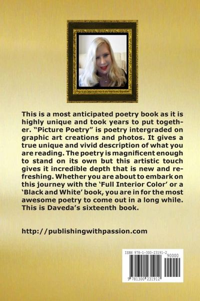 The most anticipated poetry book to come from Daveda Gruber is finally here. Having taken years of graphic art designs and poetry writing, it is here for your total enjoyment. In this Daveda's sixteenth book, discover "Picture Poetry," as this brilliant woman has named it, come to life. It is available in Hard Cover and Soft Cover both in Black and White and a Soft Cover version that is presented in Full Interior Color. Besides her own extraordinary poetry, Daveda introduces three incredible romantic poems, which are co-written with one of her poet peers by the name of Stefan Borenstein. All of the poetry is written to perfection with Free Flow verse as well as beautiful poetic forms; many of the poetic styles have been created by the author herself. Discover the variety of imagination through poetic flare and elegance that only Daveda can write. This book is a 'must have' in any poetry collection and will stand out as a gem.