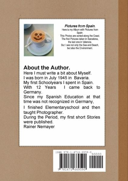 In my Book you will find Pictures from Spain. Not just the Beach and Sea, but also Cities, Landscapes and Festivals. All Photos were taken between Barcelona and Valencia. The Book was set up Cost of printing in black and white. The same Photos, you see color in my German edition "Bilder aus Spanien".