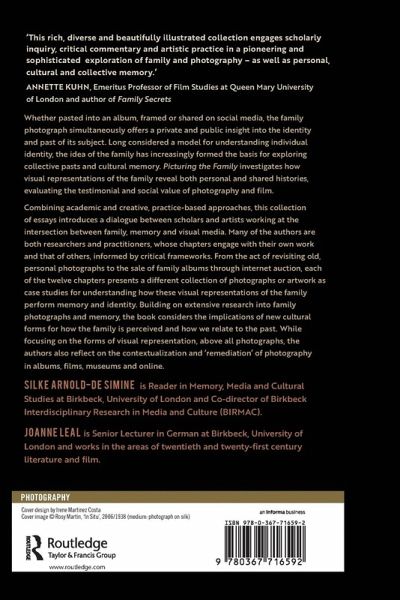 Introduction Silke Arnold- de Simine and Joanne Leal1. That Other Woman: the woman who accompanied the Cold War Tourist to Paris Martha Langford2. Memory, subjectivity and maternal histories in Un'Ora Sola Ti Vorrei (2005), Histoire d'un Secret (2003) and On the Border (2012) Lizzie Thynne3. Soviet heroes and Jewish victims: One family's memories of World War II Oksana Sarkisova and Olga Shevchenko4. Visual meditations: An island in time - (re)interpreting family albums and oral histories Suze Adams5. Performing familial memory in Against Sally Waterman6. In and out of focus: Visualising loss through the family album Jacqueline Butler7. The (re)constructed self in the safe space of the family photograph: Chino Otsuka's Imagine finding me (2005) Deborah Schultz8. A place for memory: Family photo collections, social media and the imaginative reconstruction of the working class neighbourhood Richard Lowell MacDonald9. Wanted - new custodians for family photographs: Vernacular photographs on eBay and the album as artwork Nicky Bird10. Dislocating memory: Family photographs in story-centred museums Silke Arnold-de SimineBibliographyIndex