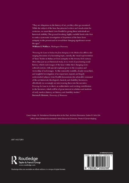 The presence of the orthopedically impaired body in art is so pervasive that, paradoxically, it has failed to attract the attention of most art historians. In Picturing the Lame in Italian Art from Antiquity to the Modern Era, Livio Pestilli investigates the changing meaning that images of individuals with limited mobility acquired through the centuries. This study evinces that in distinct opposition to the practice of classical artists, who manifested a lack of interest in the subject of lameness since it was considered 'a defect or a deformity' and deformity a 'want of measure, which is always unsightly,' their Early Christian counterparts depicted them profusely, because images of the miraculous healing of the lame became the reassuring sign of universal acceptance and the promise of a more equitable existence in this life or the next. In the Middle Ages, instead, when voluntary poverty came to be associated with the necessary condition of faithfulness to Christ, the indigent lame, along with others who were forced to beg for a living, became the image of the alter Christus. This view was to change in the Renaissance and Baroque periods, when, with the resurgence of classical and Pauline ideals that condemned the idle, representations of the orthopedically impaired became associated with swindlers, freeloaders and parasites. This fascinating story came basically to an end in the Eighteenth century when, with the revival of the Greek ideal of the Beautiful, the lame gradually left center stage to be relegated again to the margins of the visual arts.