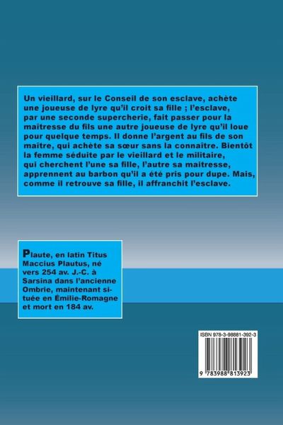 Un vieillard, sur le Conseil de son esclave, achète une joueuse de lyre qu'il croit sa fille ; l'esclave, par une seconde supercherie, fait passer pour la maîtresse du fils une autre joueuse de lyre qu'il loue pour quelque temps. Il donne l'argent au fils de son maître, qui achète sa s¿ur sans la connaître. Bientôt la femme séduite par le vieillard et le militaire, qui cherchent l'une sa fille, l'autre sa maitresse, apprennent au barbon qu'il a été pris pour dupe. Mais, comme il retrouve sa fille, il affranchit l'esclave.