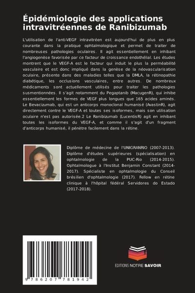 L'utilisation de l'anti-VEGF intravitréen est aujourd'hui de plus en plus courante dans la pratique ophtalmologique et permet de traiter de nombreuses pathologies oculaires. Il agit essentiellement en inhibant l'angiogenèse favorisée par ce facteur de croissance endothélial. Les études montrent que le VEGF-A est le facteur qui induit le plus la perméabilité vasculaire et est donc impliqué dans la genèse de la néovascularisation oculaire, présente dans des maladies telles que la DMLA, la rétinopathie diabétique, les occlusions vasculaires, entre autres. De nombreux médicaments sont actuellement utilisés pour traiter les pathologies susmentionnées. Il s'agit notamment du Pegaptanib (MacugenR), qui inhibe essentiellement les formes de VEGF plus longues que 165 acides aminés. Le Bevacizumab, qui est un anticorps monoclonal humanisé (AvastinR), agit directement contre le VEGF-A et toutes ses isoformes, mais son utilisation oculaire n'est pas autorisée.2 Le Ranibizumab (LucentisR) agit en inhibant toutes les isoformes du VEGF-A, et comme il s'agit d'un fragment d'anticorps humanisé, il pénètre facilement dans la rétine.