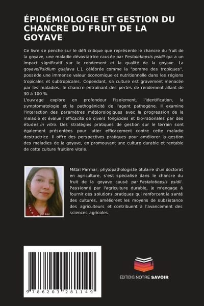 Ce livre se penche sur le défi critique que représente le chancre du fruit de la goyave, une maladie dévastatrice causée par Pestalotiopsis psidii qui a un impact significatif sur le rendement et la qualité de la goyave. La goyave(Psidium guajava L.), célébrée comme la "pomme des tropiques", possède une immense valeur économique et nutritionnelle dans les régions tropicales et subtropicales. Cependant, sa culture est gravement menacée par les maladies, le chancre entraînant des pertes de rendement allant de 30 à 100 %.L'ouvrage explore en profondeur l'isolement, l'identification, la symptomatologie et la pathogénicité de l'agent pathogène. Il examine l'interaction des paramètres météorologiques avec la progression de la maladie et évalue l'efficacité de divers fongicides et bio-rationales par des études in vitro. Des stratégies pratiques de gestion sur le terrain sont également présentées pour lutter efficacement contre cette maladie destructrice. Il offre des perspectives pratiques pour améliorer la gestion des maladies de la goyave, en promouvant une culture durable et rentable de cette culture fruitière vitale.