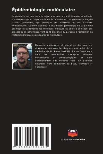 La giardiase est une maladie importante pour la santé humaine et animale. L'entéropathogène responsable de la maladie est le protozoaire flagellé Giardia duodenalis, qui provoque des diarrhées et des carences nutritionnelles. Ce livre présente la distribution génotypique de ce parasite cosmopolite et démontre les méthodes moléculaires pour sa détection. Les processus de génotypage vont de la présence du parasite à l'extraction du matériel génétique et au diagnostic moléculaire.