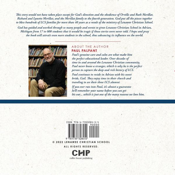 This story would not have taken place except for God's direction and the obedience of Orville and Ruth Merillat, Richard and Lynette Merillat, and the Merillat family to the fourth generation. God put all the pieces together to bless hundreds of LCS families for more than 40 years as a result of the ministry of Lenawee Christian School. God has guided and worked through so many people and events to grow Lenawee Christian School in Adrian, Michigan from 17 to 600 students that it would be tragic if those stories were never told. A portion of the proceeds will be given to student scholarships.