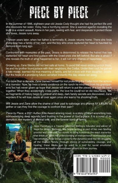 Is Every Soul Truly Worth Saving? In the summer of 1996, eighteen-year-old Jessie Cody thought she had the perfect life until she discovers her sister has a horrifying secret. Then a violent assault silences her from exposing a truth that could tear her family apart. Jessie feels her only choice is to run away. Thirteen years later, when Jessie learns her father is terminally ill, she returns home. There she finds her sister has a family of her own, the boy who once captured her heart is haunted by demons from long-ago, and her current relationship is not what appears to be. Confronted with memories of the past, Jessie is determined to release the hatred that has darkened her heart to find a place with the loved ones she left behind. Yet, she is afraid if she reveals the truth, the nightmare she never escaped will ruin any chance of happiness. Growing up, Zane Stecks did not feel safe at home. To avoid the never-ending turmoil, he and his brother found solace with their neighbors, the Cody's. Under their roof, he found a role model, learned the true the meaning of family, and fell in love with their daughter, Jessie. Zane finally felt like he belonged somewhere. But the hope of a promising future vanished instantly the day Jessie ran away. For over a decade, Zane blamed himself for not protecting the Cody's from the actions of a monster. Now, he lives a lonely existence on the ranch he inherited, but never gave up hope that Jessie would return to put the pieces of a lost life back together. When they accidently cross paths, a love he could not let die resurfaces. Yet, as fragments of history begin to unravel and deep, dark family secrets are discovered, Zane wonders if he will lose Jessie all over again once she learns his. Will Jessie and Zane find the courage to confront the truth and realize they are both worthy of love? Or will they allow the shame of their past to define them? Piece by Piece is a story of heart-wrenching loss, acknowledging deep wounds, and trusting in the power of God's grace. It is a novel of redemption, the mystery of eternal love and the forever bond of family.
