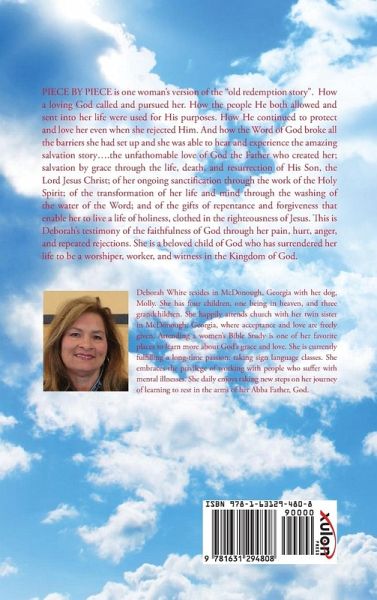 PIECE BY PIECE is one woman's version of the "old redemption story". How a loving God called and pursued her. How the people He both allowed and sent into her life were used for His purposes. How He continued to protect and love her even when she rejected Him. And how the Word of God broke all the barriers she had set up and she was able to hear and experience the amazing salvation story....the unfathomable love of God the Father who created her; salvation by grace through the life, death, and resurrection of His Son, the Lord Jesus Christ; of her ongoing sanctification through the work of the Holy Spirit; of the transformation of her life and mind through the washing of the water of the Word; and of the gifts of repentance and forgiveness that enable her to live a life of holiness, clothed in the righteousness of Jesus. This is Deborah's testimony of the faithfulness of God through her pain, hurt, anger, and repeated rejections. She is a beloved child of God who has surrendered her life to be a worshiper, worker, and witness in the Kingdom of God. Deborah White resides in McDonough, Georgia with her dog, Molly. She has four children, one being in heaven, and three grandchildren. She happily attends church with her twin sister in McDonough, Georgia, where acceptance and love are freely given. Attending a women's Bible Study is one of her favorite places to learn more about God's grace and love. She is currently fulfilling a long-time passion: taking sign language classes. She embraces the privilege of working with people who suffer with mental illnesses. She daily enjoys taking new steps on her journey of learning to rest in the arms of her Abba Father, God.