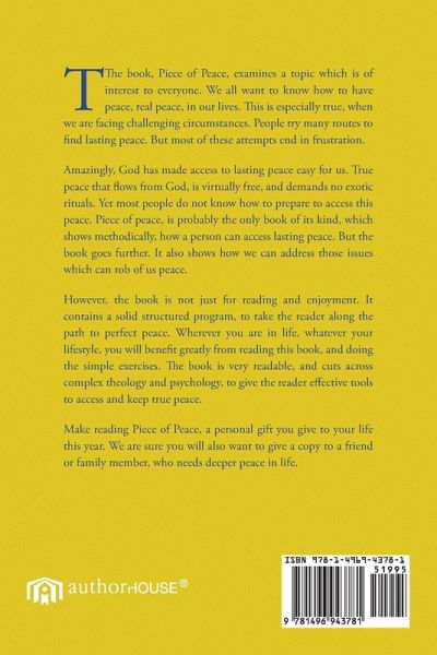 The book, Piece of Peace, examines a topic which is of interest to everyone. We all want to know how to have peace, real peace, in our lives. This is especially true, when we are facing challenging circumstances. People try many routes to find lasting peace. But most of these attempts end in frustration. Amazingly, God has made access to lasting peace easy for us. True peace that flows from God, is virtually free, and demands no exotic rituals. Yet most people do not know how to prepare to access this peace. Piece of peace, is probably the only book of its kind, which shows methodically, how a person can access lasting peace. But the book goes further. It also shows how we can address those issues which can rob of us peace. However, the book is not just for reading and enjoyment. It contains a solid structured program, to take the reader along the path to perfect peace. Wherever you are in life, whatever your lifestyle, you will benefit greatly from reading this book, and doing the simple exercises. The book is very readable, and cuts across complex theology and psychology, to give the reader effective tools to access and keep true peace. Make reading Piece of Peace, a personal gift you give to your life this year. We are sure you will also want to give a copy to a friend or family member, who needs deeper peace in life.