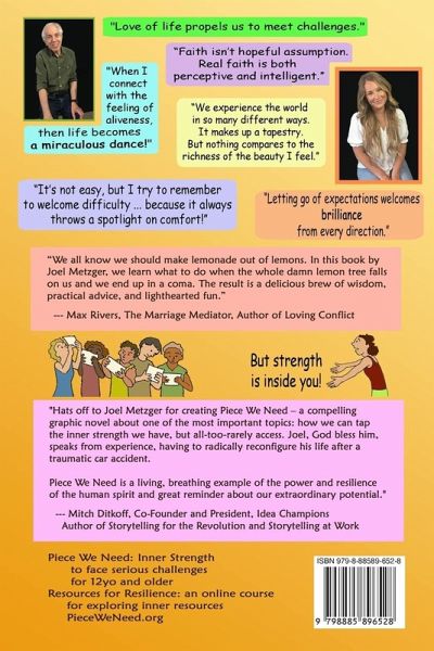 A RECIPE FOR RESILIENCE, for teens and older! Inner strength must be discovered. This unique and creative book will help you build this skill! AN IMPORTANT BOOK FOR OUR TIME Ok, it's time for some serious talk. This world is changing big-time and everybody - all of us, of every age - needs a solid foundation of inner strength. Piece We Need is a reminder of the power we hold, simply because we are alive. Be lifted as Ari and Joel share profound truths and powerful lessons in this unique and short book. Inner strength is learned and earned, and conscious living guarantees a full life. Piece We Need looks like a graphic novel and makes you laugh, sigh, and nod with its wisdom, drawings, and visual metaphors - while you learn important and valuable tools and insights. Grow personal resilience and foster a positive sense of self. Learn to face serious challenges with this entertaining, heartfelt, and honest book. Find hope in the spirit of Piece We Need, even when things seem impossible. PWN is adapted from a series of award-winning animated videos. The Teachers' Guide and Explorer's Notebook are freely available on the accompanying website. Resources for Resilience Our online course - a series of 12 videos, Pieces, sides of inner strength, from patience to persistence -- each an animated video, which is a visual metaphor illustrating a quality to learn, along with thoughts from hosts Joel and Ari, and Thinkabout comments and questions. All available for two weeks, for $39. This course is designed for grandparents and grandchildren to watch together, serving as a bridge for starting discussions and sharing wisdom. It is rare to find media that different ages can deeply enjoy together. Resources for Resilience online course: ResourcesCourse.com