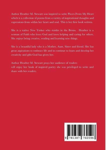 Pieces From My Heart is a variety of inspirational poetry about Life, God, Family , Culture, Goals and Aspirations and so much more. Author Heather M. Stewart is a native New Yorker who resides in the Bronx. Heather is a woman of faith who loves God and loves helping and caring for others. She enjoys being creative, reading and learning new things. She is a beautiful lady who is a Mother,Aunt, Sister and friend. She has great aspirations to embrace life and to continue to learn and develop her creativity and gifts God has given her. https://www.amazon.com/Heather-M-Stewart/e/B0B9KJPXF4/ref=aufs_dp_fta_dsk https://www.canva.com/design/DAFLORSC4_Q/cSFLt2tFvIYdDBIMVA3l1g/view?website#2:pieces-from-my-heart-~-author-heather-m-stewart-book-promotion https://www.facebook.com/bookpromotionpiecesfrommyheart https://newbookpromotionpiecesfrommyheart.blogspot.com