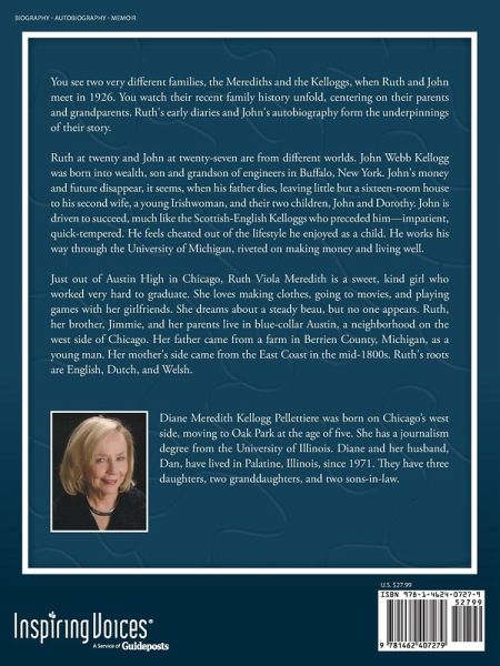 You see two very different families, the Merediths and the Kelloggs, when Ruth and John meet in 1926. You watch their recent family history unfold, centering on their parents and grandparents. Ruth's early diaries and John's autobiography form the underpinnings of their story. Ruth at twenty and John at twenty-seven are from different worlds. John Webb Kellogg was born into wealth, son and grandson of engineers in Buffalo, New York. John's money and future disappear, it seems, when his father dies, leaving little but a sixteen-room house to his second wife, a young Irishwoman, and their two children, John and Dorothy. John is driven to succeed, much like the Scottish-English Kelloggs who preceded him-impatient, quick-tempered. He feels cheated out of the lifestyle he enjoyed as a child. He works his way through the University of Michigan, riveted on making money and living well. Just out of Austin High in Chicago, Ruth Viola Meredith is a sweet, kind girl who worked very hard to graduate. She loves making clothes, going to movies, and playing games with her girlfriends. She dreams about a steady beau, but no one appears. Ruth, her brother, Jimmie, and her parents live in blue-collar Austin, a neighborhood on the west side of Chicago. Her father came from a farm in Berrien County, Michigan, as a young man. Her mother's side came from the East Coast in the mid-1800s. Ruth's roots are English, Dutch, and Welsh.