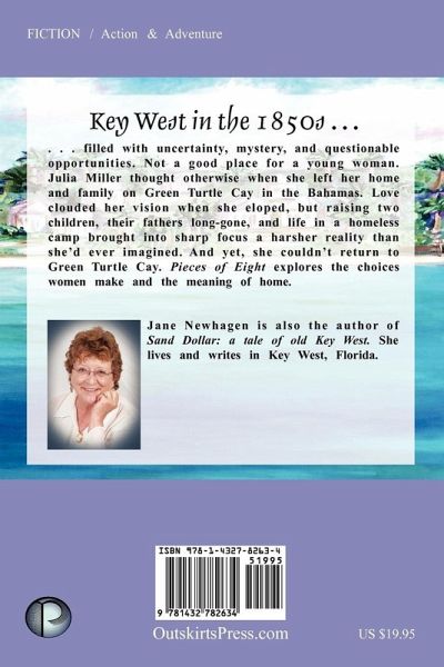 Pieces of Eight ~ a tale of old Key West Key West in the 1850s was filled with uncertainty, mystery, and questionable opportunities. Not a good place for a young woman. Julia Miller thought otherwise when she left her home and family on Green Turtle Cay in the Bahamas. Love clouded her vision when she eloped, but raising two children, their fathers long-gone, and life in a homeless camp brought into sharper focus a harsher reality than she'd ever imagined. And yet, she couldn't return to Green Turtle Cay. In this meticulously-researched and engagingly-narrated story, the author recreates this exciting tropical city while exploring the choices women make and the meaning of home. From the author I once lived in a house that was brought to Key West from the Bahamas in the 1800's. The thick heart pine walls were so hard they bent nails. At the kitchen doorway, old wood cupped beneath a new sill. I knew there was dust in the cracks that dated from the original owners. I put a pencil and paper in the attic in case there was a spirit presence with something to say. There wasn't, but I never lost the sense of the people who lived there before me. Jane Newhagen is also the author of Sand Dollar ~ a tale of old Key West. She lives and writes in Key West, Florida.