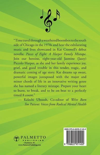 Time travel through a weathered boombox to the south side of Chicago in the 1970s to hear the exhilarating music and lives showcased in Kat Croswell's: Pieces of Eight: A Harper Family Mixtape. Join our heroine, eight-year-old Jasmine (Jazzy) Piccolo Harper, as she and her family experience joy, grief, and good trouble in this tender, tragic, and dramatic coming of age story. Kat dreams up sweet powerful images juxtaposed with the major and minor chords of life in an innovative writing genre she has named a literary mixtape. Prepare your heart to burst, to break, and to be on beat to a perfectly timed 8 count." - Kelechi Ubozoh, Co-editor of We've Been Too Patient: Voices from Radical Mental Health The narrative revolves around Jazzy's family - Joanne, Phillip, Jackson, Jacy, Jamar, Joseph, and their faithful dog, Brutus. Each character adds a layer of depth and richness to the story. The journey is further enriched by Jazzy's friends, Pookie, Beans and the Snaggletooth Twins, the enigmatic neighbor, Old Lady UpChurch, and the new boy in town, Buster Beaudreaux. Pieces of Eight transcends the boundaries of a typical story; it is a literary symphony, resonating with a captivating and refreshing rhythm. The embedded soundtrack offers readers an innovative and authentic storytelling experience. Each page is a testament to human resilience, the significance of family ties, and the transformative power of music. It's a narrative that will evoke laughter, tears, and provoke thoughts that linger, resonating long after the last page is turned.