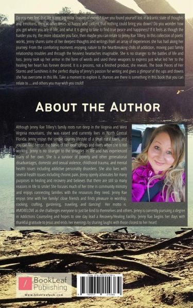 Do you ever feel that life is one big roller coaster of events? Have you found yourself lost in a frantic state of thoughts and emotions, then at other times so happy and content that nothing could bring you down? Do you wonder how you got where you are in life, and what it is going to take to find true peace and happiness? If it feels as though the harder you try, the more obstacles you face, then maybe you can relate to Jenny Rae Tillery. In this collection of poetic works, Jenny shares some of her deepest thoughts and writings from an array of experiences she has had along her journey. From the comforting moments enjoying nature to the heartbreaking chills of addiction, moving past family relationship troubles and through the heaviest heartaches imaginable. She is no stranger to the battles of life and loss. Jenny took up her armor in the form of words and used these weapons to express just what led her to the healing her heart has forever desired. It is a process, not a finished product, she reveals. The book Pieces of Her Storms and Sunshines is the perfect display of Jenny's passion for writing and gives a glimpse of the ups and downs she has overcome in this life. Take a moment to explore it, chances are there is something in this book that you can relate to ... and others you may wish you could!