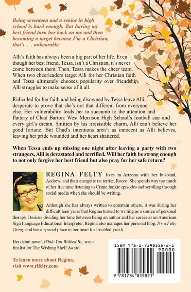Being seventeen and a senior in high school is hard enough. But having my best friend turn her back on me and then becoming a target because I'm a Christian, that's . . . unbearable. Alli's faith has always been a big part of her life. Even though her best friend, Tessa, isn't a Christian, it's never come between them. Then, Tessa makes the cheer team. When two cheerleaders target Alli for her Christian faith and Tessa ultimately chooses popularity over friendship, Alli struggles to make sense of it all. Ridiculed for her faith and being disowned by Tessa leave Alli desperate to prove that she's not that different from everyone else. Her vulnerability leads her to succumb to the attention and flattery of Chad Barton: West Morrison High School's football star and every girl's dream. Smitten by his irresistible charm, Alli can't believe her good fortune. But Chad's intentions aren't as innocent as Alli believes, leaving her pride wounded and her heart shattered. When Tessa ends up missing one night after leaving a party with two strangers, Alli is devastated and terrified. Will her faith be strong enough to not only forgive her best friend but also pray for her safe return?