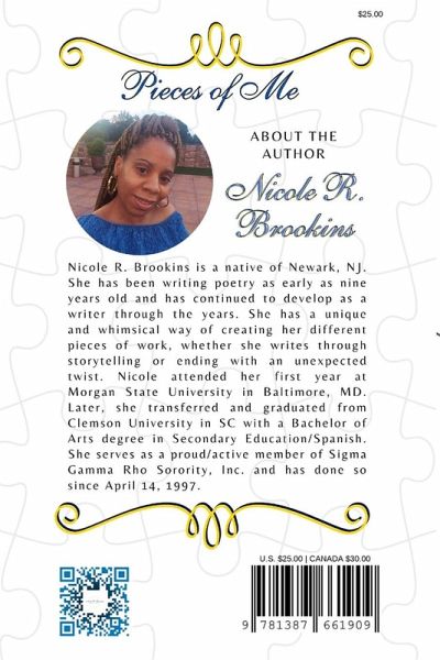 The book, Pieces of Me by Nicole R. Brookins is a group of a wide range of unique poems and a short story. This groundbreaking work is a reflection of some of her life experiences as well as a deeper look into her story telling and detailed imagination.