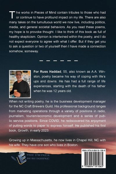 The works in Pieces of Mind contain tributes to those who had or continue to have profound impact on my life. There are also many takes on the tumultuous world we now live, including politics, media, and general societal behaviors. As you read these poems, my hope is to provoke thought. I like to think of this book as full of healthy skepticism. Opinion is intertwined within the poetry, and I do not expect everyone to agree with what I offer. But if they get you to ask a question or two of yourself then I have made a connection somehow, someway.
