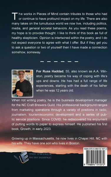 The works in Pieces of Mind contain tributes to those who had or continue to have profound impact on my life. There are also many takes on the tumultuous world we now live, including politics, media, and general societal behaviors. As you read these poems, my hope is to provoke thought. I like to think of this book as full of healthy skepticism. Opinion is intertwined within the poetry, and I do not expect everyone to agree with what I offer. But if they get you to ask a question or two of yourself then I have made a connection somehow, someway.