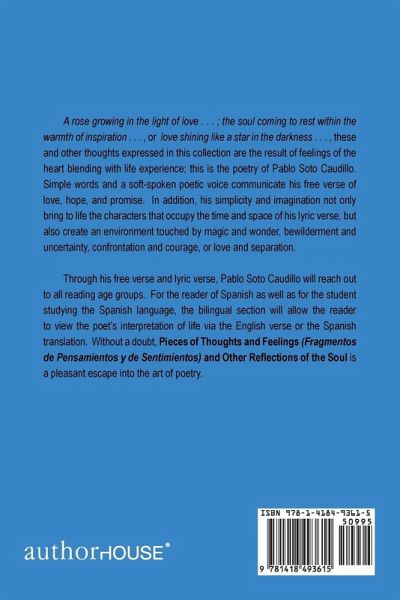 A rose growing in the light of love . . . ; the soul coming to rest within the warmth of inspiration . . . , or love shining like a star in the darkness . . . , these and other thoughts expressed in this collection are the result of feelings of the heart blending with life experience; this is the poetry of Pablo Soto Caudillo. Simple words and a soft-spoken poetic voice communicate his free verse of love, hope, and promise. In addition, his simplicity and imagination not only bring to life the characters that occupy the time and space of his lyric verse, but also create an environment touched by magic and wonder, bewilderment and uncertainty, confrontation and courage, or love and separation. Through his free verse and lyric verse, Pablo Soto Caudillo will reach out to all reading age groups. For the reader of Spanish as well as for the student studying the Spanish language, the bilingual section will allow the reader to view the poet’s interpretation of life via the English verse or the Spanish translation. Without a doubt, Pieces of Thoughts and Feelings (Fragmentos de Pensamientos y de Sentimientos) and Other Reflections of the Soul is a pleasant escape into the art of poetry.