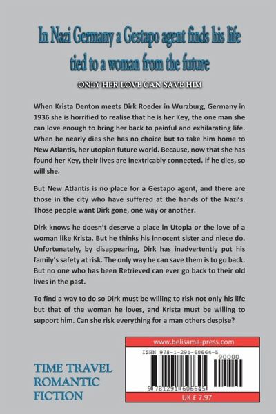 When Krista Denton meets Dirk Roeder in Wurzburg, Germany in 1936 she is horrified to realise that he is her Key, the one man she can love enough to bring her back to painful and exhilarating life. When he nearly dies she has no choice but to take him home to New Atlantis, her utopian future world. Because, now that she has found her Key, their lives are inextricably connected. If he dies, so will she. But New Atlantis is no place for a Gestapo agent, and there are those in the city who have suffered at the hands of the Nazi's. Those people want Dirk gone, one way or another. Is Krista willing to risk everything for a man others despise?