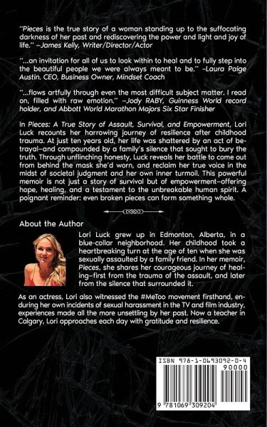 In Pieces: A True Story of Assault, Survival, and Empowerment, Lori Luck recounts her harrowing journey of resilience after childhood trauma. At just ten years old, her life was shattered by an act of betrayal-and compounded by a family's silence that sought to bury the truth. Through unflinching honesty, Luck reveals her battle to come out from behind the mask she'd worn, and reclaim her true voice in the midst of societal judgment and her own inner turmoil. This powerful memoir is not just a story of survival but of empowerment-offering hope, healing, and a testament to the unbreakable human spirit. A poignant reminder: even broken pieces can form something whole.