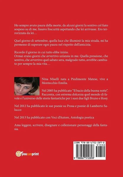 Ho sempre avuto paura della morte, alcuni giorni la sentivo col fiato sospeso su di me, fissavo l'oscurità aspettando che lei arrivasse. Ero terrorizzata da lei... Ma quel giorno di settembre, quella luce che illuminò la mia strada, mi ha permesso di superare ogni paura nel rispetto dell'amicizia. Ricordo il giorno in cui tutto ebbe inizio, ormai erano giorni che avvertivo un ansia in me. Quella pressione, che avvertivo quel sabato sera malgrado tutto avrebbe cambiato per sempre la mia vita...