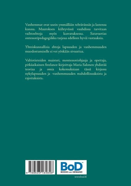 Vanhemmat ova usein ymmällään tehtävänsä ja lastensa kanssa. Muutoksen kiihtyvässä vauhdissa tarvitaan vaihtoehtoja myös kasvatuksessa. Satavuotinen montessoripedagogiikka tarjoaa edelleen hyviä ajatuksia. Yhteiskunnallisia ehtoja lapsuuden ja vanhemmuuden muodostumiselle ei voi myöskään sivuuttaa. Valtiotieteiden maisteri, montessoriohjaaja ja opettaja, pitkäaikainen freelance-toimittaja ja kahden pojan äiti Maria Salonen yhdistää teoriaa ja omia kokemuksiaan tässä kirjassa nykylapsuuden ja -vanhemmuuden mahdollisuuksista ja rajoituksista.