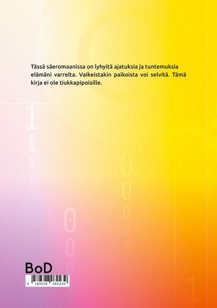 Tässä säeromaanissa on lyhyitä ajatuksia ja tuntemuksia elämäni varrelta. Vaikeistakin paikoista voi selvitä. Tämä kirja ei ole tiukkapipoisille.