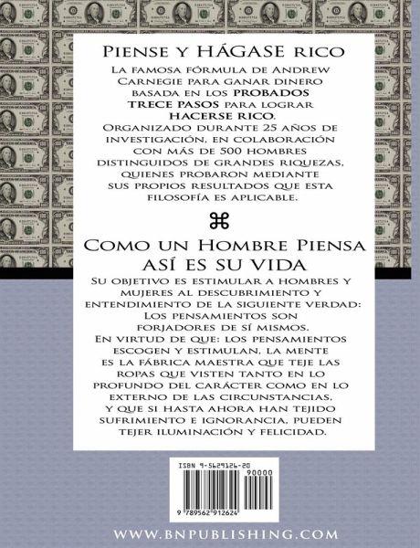 Piense y hágase rico & Como un Hombre Piensa Asi es Su Vida (2 en 1) PIENSE Y HÁGASE RICO Enseñando por primera vez, la famosa formula de Andrew Carnegie para ganar dinero basada en los PROBADOS TRECE PASOS para lograr HACERSE RICO. Organizado durante 25 años de investigación, en colaboración con más de 500 hombres distinguidos de grandes riquezas, quienes probaron mediante sus propios resultados que está filosofía es aplicable. Como un Hombre Piensa Asi es Su Vida Este libro (resultado de la meditación y la experiencia) no intenta ser un tratado exhaustivo acerca del poder del pensamiento, de lo que ya mucho se ha escrito. Es más bien sugestivo antes que explicativo, su objetivo es estimular a hombres y mujeres al descubrimiento y al entendimiento de la siguiente verdad: Los pensamientos son forjadores de sí mismos.
