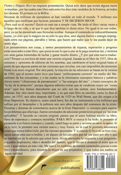Think and Grow Rich Spanish Edition. Piense y Hágase Rico no requiere presentación. Quizá solo decir que existe alguna razón -o muchas-, por las cuales este libro está entre los diez más vendidos de la historia, en todos los idiomas. El primero es la Biblia. Docenas de millones de ejemplares se han vendido en todo el mundo. Y millones son aquellos que confiesan que leyeron, pensaron Y SE HICIERON RICOS. ¿Pero cuál es el secreto? Quizá no esté tan a simple vista. He leído el libro varias veces a lo largo de mi vida, y sé que lo que dice también lo dicen otros. No igual ni en ese orden, pero, yo no he encontrado aún fórmulas ocultas. Aunque el contenido es indiscutiblemente bueno, yo creo que lo mágico no es sólo lo que dice, sino alguna fuerza o energía impregnada entre sus páginas, párrafos y letras, que hacen que nadie que lo lea pueda dejar de sentir algo... Los pensamientos son cosas, y tantos pensamientos de riqueza, superación y progreso están asociados a este libro, que quizá es eso lo que a uno se le pega mientras lee, y termina con unas ganas tremendas de luchar y ganar mucho dinero. ¿Y por qué esta nueva traducción? Porque ya era hora de tener una versión original, basada en el libro de 1937, libre de censuras y opiniones de editores de los sesentas, que cambiaron el texto original hasta el punto de que algunas partes en las versiones que circulan, son casi imposibles de reconocer frente a su texto original. Por otra parte, la mayoría de las ediciones se basan en la versión de 1960, que el mismo autor tuvo que hacer "políticamente correcta" en medio del Macartismo de los cincuentas; y a las cuales se le eliminaron conceptos básicos y palabras claves como "vibraciones de pensamiento" o "las energías del éter", o hasta conceptos de "la ley de la atracción", porque algunos editores creían que se venderían mejor sin "cosas raras" (que hoy hemos descubierto que no sólo son tan ciertas, sino fundamentales). Además, hay otra razón muy importante, y es que este libro se escribió, como lo dice el autor, en 1935, seis años después del Crash de 1929 en Wall Street, que dio origen a la Gran Depresión. Su objetivo, como usted leerá, fue dar un instrumento a los millones que sufrían por el desempleo y la pobreza aún seis años después del comienzo de la crisis. Docenas y docenas de comentarios acerca de la Gran Depresión -y consejos para superar los problemas que ella trajo, fueron cercenados de ediciones posteriores porque ya "no eran aplicables". Y leyendo su versión original, parece que el autor hubiese escrito su libro, lleno de esperanza y consejos increíbles. PARA HOY si nunca lo ha leído, le presento el pasaporte a su futuro (siempre y cuando, usted haga su parte y se tome en serio la tarea). Si ya lo leyó, le presento una versión nueva y muy fresca, en la cual le prometo encontrará cosas que nunca había leído, por las razones apuntadas. Y si cuando lo leyó no se hizo rico, quizá sea en esta nueva leidita, y en alguno de los párrafos que tal vez pasó por alto o que no estaban en en la edición que usted tenía, dónde encuentre la respuesta a sus preguntas, o aquella inspiración, idea o destello del destino, que lo lleven a alcanzar el éxito que es suyo y que merece en esta vida. Me uno a los millones de mentes conectadas gracias a este libro extraordinario, para desearle lo mejor en sus propósitos, y que todos sus sueños se hagan realidad.