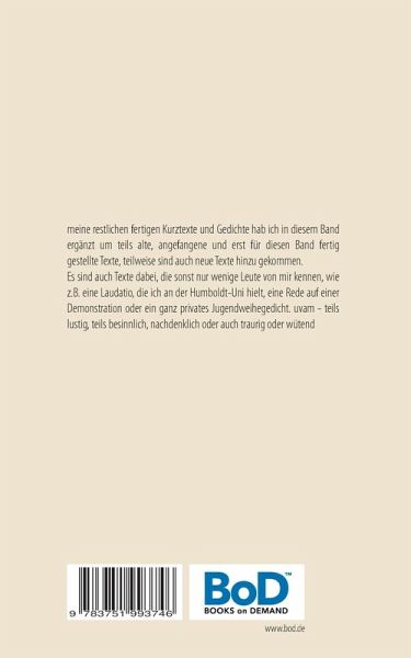 meine restlichen fertigen Kurztexte und Gedichte hab ich in diesem Band ergänzt um teils alte, angefangene und erst für diesen Band fertig gestellte Texte, teilweise sind auch neue Texte hinzu gekommen.Es sind auch Texte dabei, die sonst nur wenige Leute von mir kennen, wie z.B. eine Laudatio, die ich an der Humboldt-Uni hielt, eine Rede auf einer Demonstration oder ein ganz privates Jugendweihegedicht. uvam - teils lustig, teils besinnlich, nachdenklich oder auch traurig oder wütend