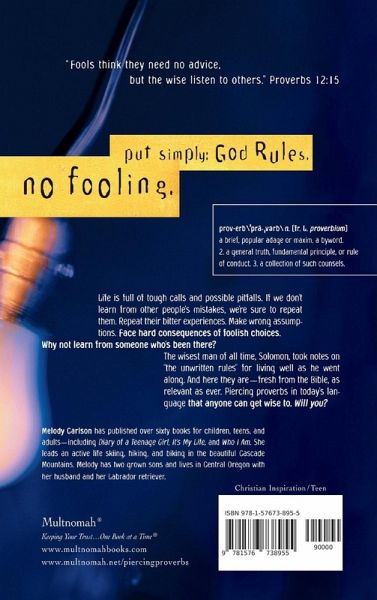 More and more teens find themselves growing up in a world lacking in godly wisdom and direction. In Piercing Proverbs, bestselling youth fiction author Melody Carlson offers solid messages of the Bible in a version that can compete with TV, movies, and the Internet for the attention of this vital group in God's kingdom. Choosing life-impacting portions of teen-applicable Proverbs, Carlson paraphrases them into understandable, teen-friendly language and presents them as guidelines for clearly identified areas of life (such as friendship, family, money, and mistakes). Teens will easily read and digest these high-impact passages of the Bible delivered in their own words.