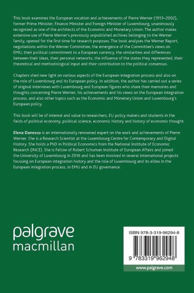Chapters shed new light on various aspects of the European integration process and also onthe role of Luxembourg and its European policy. In addition, the author has carried out a series of original interviews with Luxembourg and European figures who share their memories and thoughts concerning Pierre Werner, his achievements and his views on the European integration process, and also other topics such as Economic and Monetary Union and Luxembourg's European policy.