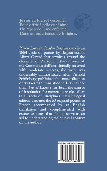 Pierrot Lunaire: Rondels Bergamasques is an 1884 cycle of poems by Belgian author Albert Giraud that revolves around the character of Pierrot and the universe of the Commedia dell'arte. Initially received with moderate success, the work was undeniably immortalized after Arnold Schönberg published the musicalization of its German translation in 1912. Since then, Pierrot Lunaire has been the source of inspiration for numerous works of art in all sorts of disciplines. This bilingual edition presents the 50 original poems in French accompanied by an English translation and complemented with extensive notes that should serve as an aid to understanding the cultural context of the author.