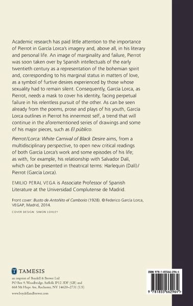 Academic research has paid little attention to the importance of the figure of Pierrot in Garcia Lorca's imagery and, above all, in his literary and personal life. An image of marginality and failure, Pierrot was soon taken over by Spanish intellectuals of the early twentieth century as a representation of the bohemian spirit and, corresponding to his marginal status in matters of love, as a symbol of furtive desires experienced by those whose sexuality had to remain silent. Consequently, Garcia Lorca, as Pierrot, needs a mask to cover his identity, facing perpetual failure in his relentless pursuit of the other. As can be seen already from the poems, prose and plays of his youth, Garcia Lorca outlines in Pierrot his innermost self, a trend that will continue in the aforementioned series of drawings and some of his major pieces, such as El publico. Pierrot / Lorca: White Carnival of Black Desire aims, from a multidisciplinary perspective, to open new critical readings of both Garcia Lorca's work and some episodes of his life; as with, for example, his relationship with Salvador Dali, which can be presented in theatrical terms: Harlequin (Dali) / Pierrot (Garcia Lorca). Emilio Peral Vega is Associate Professor of Spanish Literature at the Universidad Complutense de Madrid.
