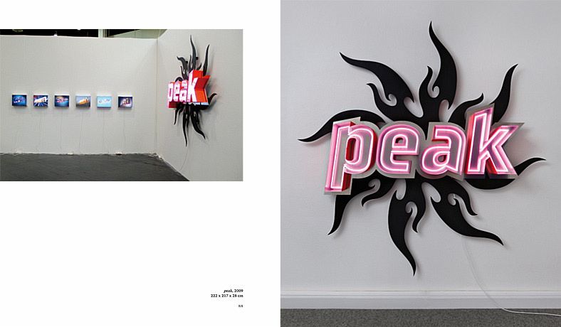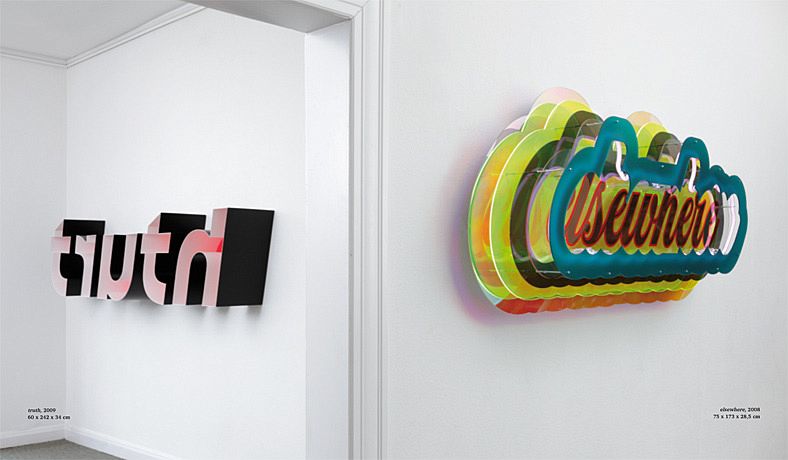 Pietro Sanguinetis Arbeiten, deren Sujet vorwiegend Sprache ist, erinnern an die grelle Ästhetik von Logos und Werbung, binden dabei jedoch den Blick gleichzeitig an die Kunstgeschichte und erinnern an René Magritte, Andy Warhol, Joseph Kosuth, Ken Lum und andere . Im Zusammenspiel mit den Bedeutungsfeldern von Begriffen wie »LOST«, »paradise«, »EGO«, »(now)« und »beyond«, die zum Bildmotiv werden, bergen die leuchtenden Oberflächen ein komplexes Referenzsystem, in welchem die Arbeiten ihren Grund haben. Die offensive Visualität, mit der Sprache hier in Erscheinung tritt, bringt der "reinen" Bedeutung der Worte Differenzen bei, und »verunreinigt« sie dadurch. Diese différances sind beabsichtigt: »Ceci n est pas une pipe«.