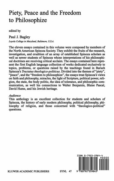 Divided into the themes of piety, peace, and the freedom to philosophize, the essays treat Spinoza's views on faith and philosophy, miracles, the light of Scripture, political power, religion, the state, the body politic, the idea of tolerance, and philosophic communication, as well as his connections to Walter Benjamin, Blaise Pascal, David Hume, and his Jewish heritage.