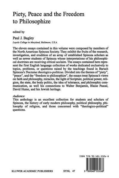 Divided into the themes of piety, peace, and the freedom to philosophize, the essays treat Spinoza's views on faith and philosophy, miracles, the light of Scripture, political power, religion, the state, the body politic, the idea of tolerance, and philosophic communication, as well as his connections to Walter Benjamin, Blaise Pascal, David Hume, and his Jewish heritage.