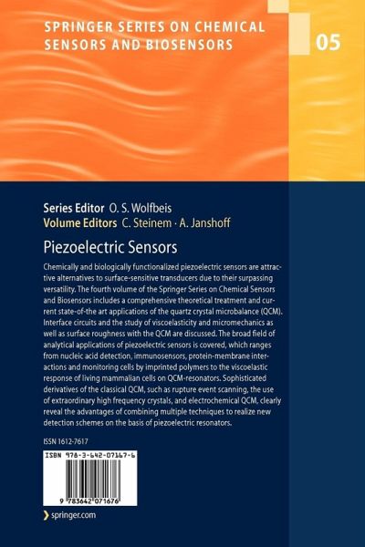 Chemically and biologically functionalized piezoelectric sensors are attractive alternatives to surface-sensitive transducers due to their surpassing versatility. The fourth volume of the Springer Series on Chemical Sensors and Biosensors includes a comprehensive theoretical treatment and current state-of-the art applications of the quartz crystal microbalance (QCM). Interface circuits and the study of viscoelasticity and micromechanics as well as surface roughness with the QCM are discussed. The broad field of analytical applications of piezoelectric sensors is covered, which ranges from nucleic acid detection, immunosensors, protein-membrane interactions and monitoring cells by imprinted polymers to the viscoelastic response of living mammalian cells on QCM-resonators. Sophisticated derivatives of the classical QCM, such as rupture event scanning, the use of extraordinary high frequency crystals, and electrochemical QCM, clearly reveal the advantages of combining multiple techniques to realize new detection schemes on the basis of piezoelectric resonators.