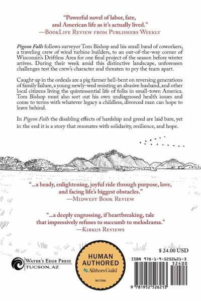 Pigeon Falls follows surveyor Tom Bishop and his small band of coworkers, a traveling crew of wind turbine builders, to an out-of-the-way corner of Wisconsin's Driftless Area for one final project of the season before winter arrives. During their week amid this distinctive landscape, unforeseen challenges test the crew's character and threaten to pry the team apart. Caught up in the ordeals are a pig farmer hell-bent on reversing generations of family failure, a young newly-wed resisting an abusive husband, and other local citizens living the quintessential life of folks in small-town America. Tom Bishop must also sort out his own undiagnosed health issues and come to terms with whatever legacy a childless, divorced man can hope to leave behind. In Pigeon Falls the disabling effects of hardship and greed are laid bare, yet in the end it is a story that resonates with solidarity, resilience, and hope.