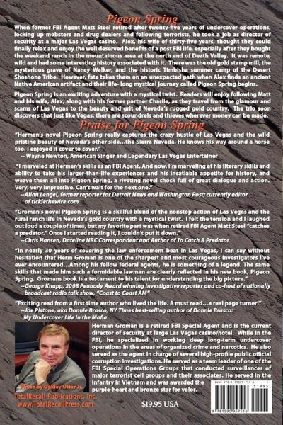 Pigeon Spring Iconic Las Vegas entertainer Wayne Newton said, "Danke Schoen to Groman. I enjoyed reading Pigeon Spring from cover to cover." After 25 years as an undercover FBI agent, Matt Steel decides to retire and takes a job as the director of security at a major Las Vegas casino. Matt and Alex, his wife, thought they could finally relax and enjoy life at their ranch in the mountainous region of Death Valley. However, fate takes them on an unexpected path when Alex finds an ancient Native American artifact on their property that plays a pivotal role in the novel's surprise ending. Readers will enjoy following Matt, Alex, and Charlie (Matt's longtime partner at the bureau) as they travel from the glamour and scams of Las Vegas to the beauty and grit of Nevada's rugged gold country. The former FBI agents go to work after Matt recognizes the subtle trademarks a crook he encountered 15 years earlier. Things get personal when Matt discovers that a corrupt official is helping his former nemesis to steal a gold claim from two of his friends. Groman employs a murder for hire scheme, wiretaps, surveillances, and a mystical twist to keep reader engaged from beginning to end. In real life, FBI Agent Herman Groman was like a TV action hero, full of life, full of boyish enthusiasm, a fearless crime fighter who took down dirty judges and dirty cops and scary mobsters. I marveled at his skills as an FBI Agent. And now, much to my surprise and delight, I am marveling at his literary skills and ability to take his larger-than-life experiences and his insatiable appetite for history, and weave them all into Pigeon Spring, a riveting novel chock full of great dialogue and action. Very, very impressive. Can not wait for the next one. -- Allan Lengel, former reporter for Detroit News and Washington Post; currently editor of ticklethewire.com Gromans debut novel Pigeon Spring is a skillful blend of the nonstop action of Las Vegas and the rural ranch life in Nevadas gold country with a mystical twist. His background as a veteran FBI Special Agent and Las Vegas casino security director gives him a unique and realistic insight into both worlds. I felt the tension and I laughed out loud a couple of times, but my favorite part was when retired FBI Agent Matt Steel catches a predator. Once I started reading it, I could not put it down. -- Chris Hansen, Dateline NBC Correspondent and Author of To Catch A Predator Herm Groman is one of the sharpest and most courageous investigators I have ever encountered... Among his fellow federal agents, he is something of a legend. The same skills that made him such a formidable lawman are clearly reflected in his new book, Pigeon Spring. He is an astute student of human nature, a keen observer of his surroundings, and has a unique ability to focus on the stuff that really matters. Nevada is a better place because Herm Groman came here, and this book is a testament to his talent for understanding the big picture. -- George Knapp, 2008 Peabody Award winning investigative reporter and co-host of nationally broadcast radio talk sho, Coast to Coast AM Pigeon Spring has something for every reader: suspense, history and a great story line. Groman not only spins a great yarn, but his years of experience as a Special Agent with the FBI brings a gritty authenticity to the book. A wonderful read. -- Lt. Randy Sutton, Las Vegas Metropolitan Police Dept; Author of True Blue: Police Stories by Those Who Have Lived Them, A Cops Life and True Blue: To protect and Serve. Exciting read from an author who lived the life. A must read...a real page turner! -- Joe Pistone, aka Donnie Brasco, NY Times best-selling author of Donnie Brasco: My Undercover Life in the Mafia