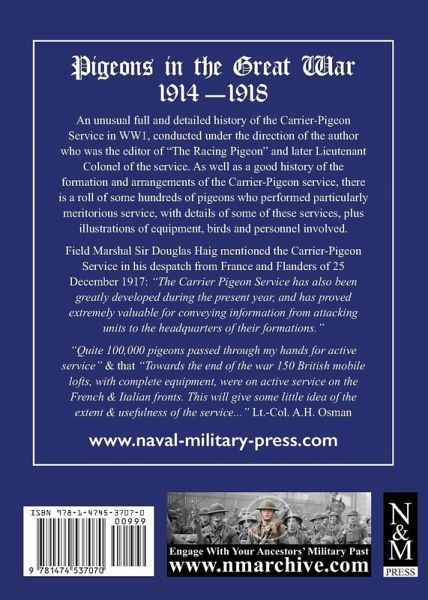 An unusual full and detailed history of the Carrier-Pigeon Service in WW1, conducted under the direction of the author who was the editor of "The Racing Pigeon" and later Lieutenant Colonel of the service. As well as a good history of the formation and arrangements of the Carrier-Pigeon service, there is a roll of some hundreds of pigeons who performed particularly meritorious service, with details of some of these services, plus illustrations of equipment, birds and personnel involved. Osman helped make officials aware of the valuable role pigeons could play in wartime communications, and became head of the Home Office Pigeon Service. The birds were vital to the army and navy - for example, they were used to communicate between Royal Navy ships that didn't have wireless telegraph systems. Field Marshal Sir Douglas Haig mentioned the Carrier-Pigeon Service in his despatch from France and Flanders of 25 December 1917: "The Carrier Pigeon Service has also been greatly developed during the present year, and has proved extremely valuable for conveying information from attacking units to the headquarters of their formations." "Quite 100,000 pigeons passed through my hands for active service" & that "Towards the end of the war 150 British mobile lofts, with complete equipment, wee on active service on the French & Italian fronts. This will give some little idea of the extent & usefulness of the service..." Lt.-Col. A.H.Osman